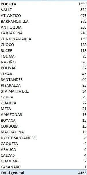 Los casos se encuentran discriminados por departamentos de la siguiente manera.