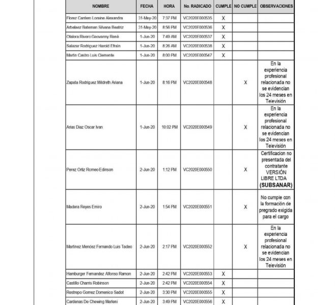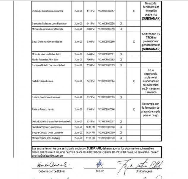 A través del enlace https://www.telecaribe.co/convocatorias-2020, se podrá descargar la lista de aspirantes que cumplieron con los requisitos mínimos exigidos, así como los que no cumplieron y los que deben subsanar.