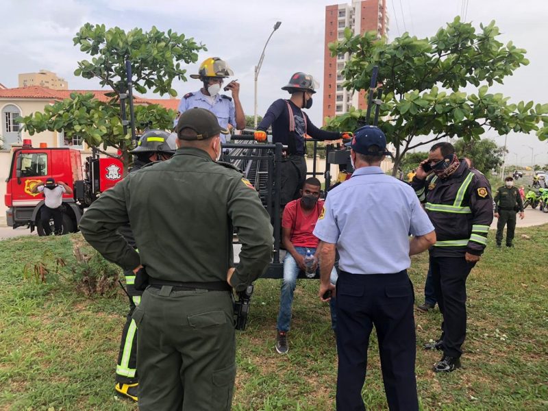 Uniformados de la Policía y del Cuerpo de Bomberos realizaron un gesto heroico este viernes, tras rescatar a un hombre que pretendía quitarse la vida lanzándose de una torre de energía de más de 20 metros de altura ubicada al norte de la ciudad de Barranquilla.
