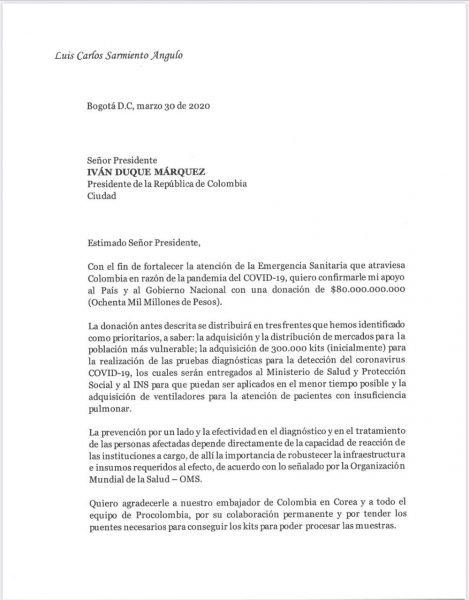 El poderoso empresario Luis Carlos Sarmiento Angulo, a través de una carta dirigida al presidente de la República, Iván Duque Márquez, anunció la donación de 80 mil millones de pesos al país y al Gobierno Nacional para atender la emergencia generada por la propagación del coronavirus.