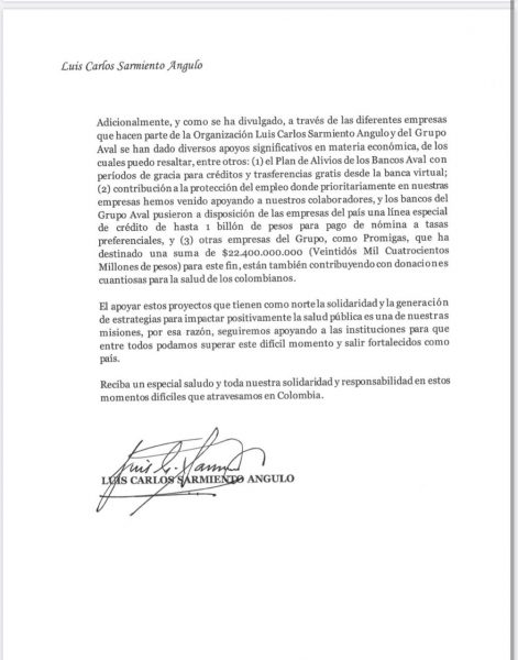 Además, en la misiva el reconocido empresario destaca las ayudas que han brindado las empresas de su propiedad, entre las que se encuentran el Grupo Aval y Promigas, mostrando así su compromiso social con los colombianos.