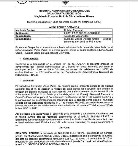 En las últimas horas se conoció que fue admitida la demanda interpuesta por un ciudadano identificado como Alexander Vides, contra el alcalde electo del municipio de San José de Uré, Custodio Liborio Acosta Urzola. El fallo fue emitido por el Tribunal Administrativo de Córdoba.