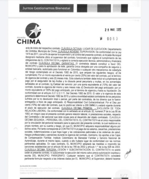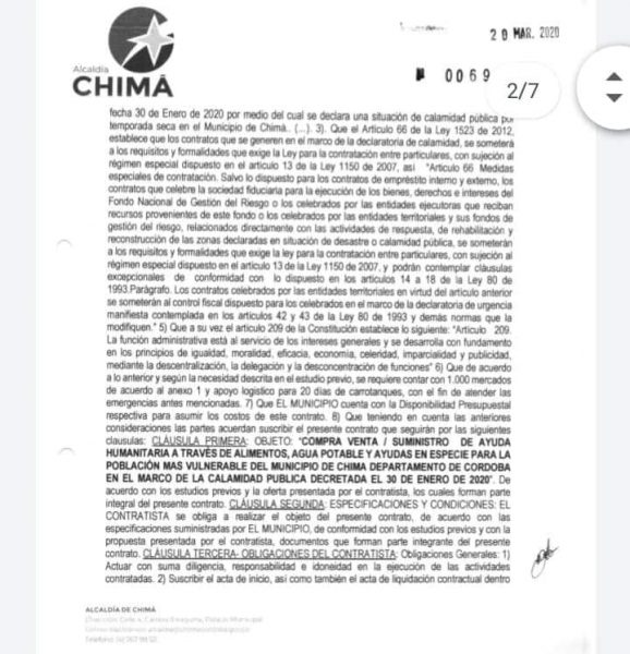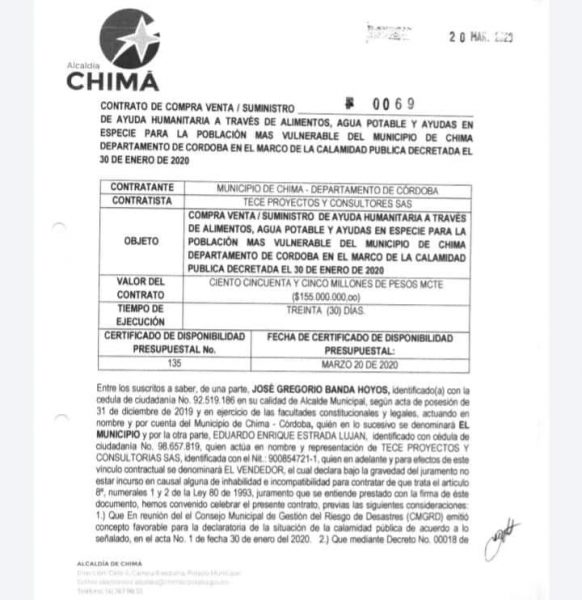De acuerdo con la denuncia realizada por la página Sucesos Córdoba (Facebook), el alcalde de los chimaleros realizó un contrato por 155 millones de pesos con la consultora ‘Tece Proyectos y Consultorías’ y que tenía como objeto “la compraventa/suministro de ayuda humanitaria a través de alimentos, agua potable y en especie para la población más vulnerable del municipio en el marco de la calamidad pública decretada el 30 de enero del 2020”.