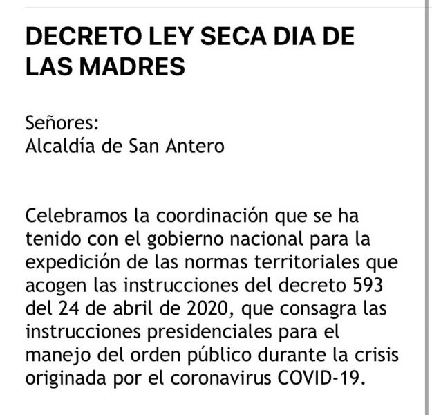 Tal como lo había afirmado en el día de ayer a través de su cuenta de Twitter, el asesor jurídico de San Antero, Roberth Angulo, el Ministerio del Interior ratificó que alcaldes no podrán decretar Ley Seca en sus municipios.