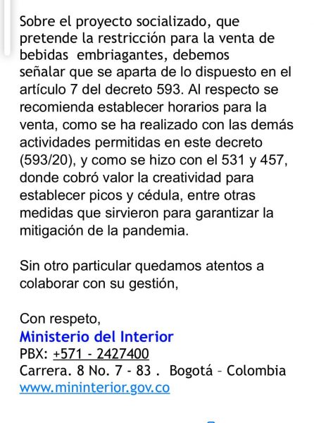 “Una decisión en ese sentido por parte de los alcaldes, sería contraria al decreto 593 de 24 de abril de 2020, que en su artículo 7 permite la venta de bebidas embriagantes”, manifiesta Angulo.