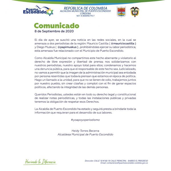 Luego que, a través de redes sociales se relacionaran las amenazas que han recibido los periodistas de la región Mauricio Castilla y Diego Muskus, con el municipio de Puerto Escondido, la alcaldesa, Heydi Torres, se pronunció al respecto.