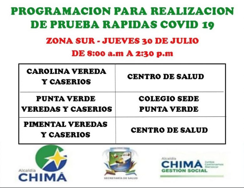 Dicha información fue corroborada por la secretaría de Salud, quienes manifestaron que han hecho pruebas rápidas en los corregimientos Carolina, Punta Verde y Pimental con sus respectivas veredas y caseríos, para detectar oportunamente los contagios.