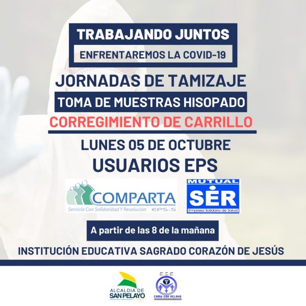 La Alcaldía de San Pelayo, a través de la Secretaría de Salud y con el apoyo de la ESE Camu Municipal, adelantarán el próximo lunes 5 de octubre, una jornada de toma de muestras Covid-19.