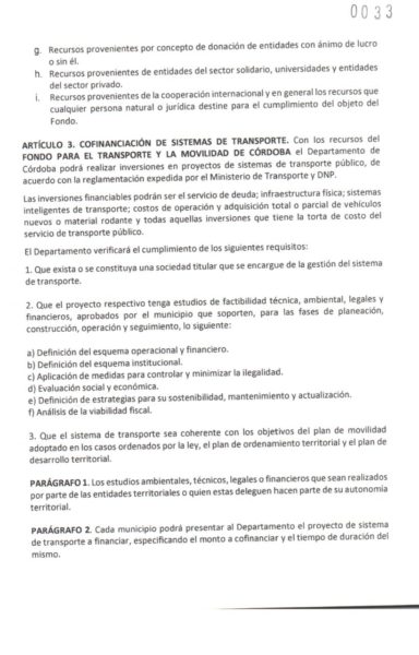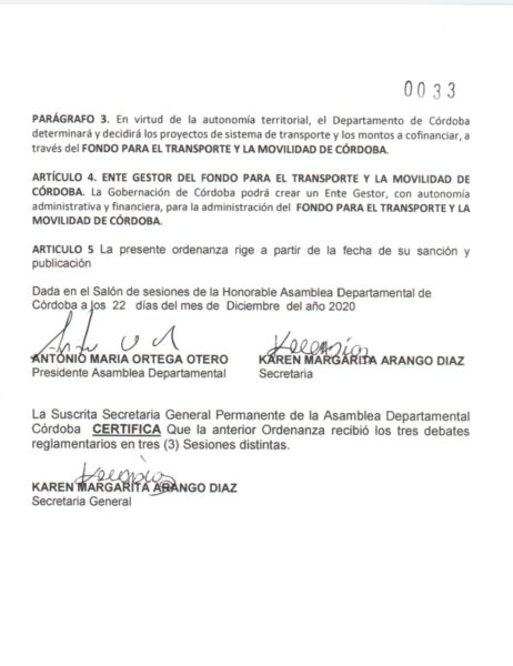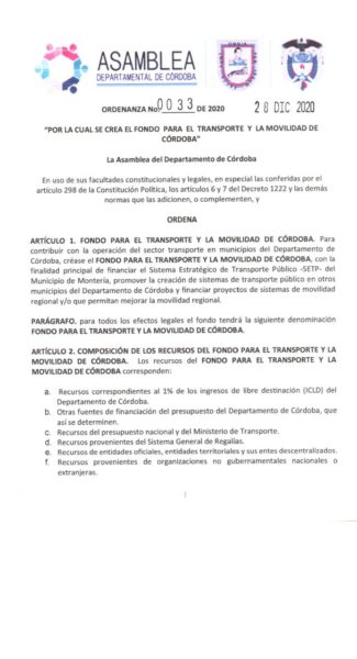 La Asamblea departamental de Córdoba a través de la Ordenanza 0033 ordenó la creación del fondo para el transporte y la movilidad del departamento.