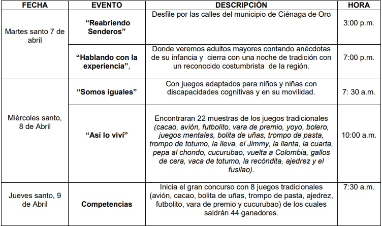 En el marco de la celebración de la Semana Santa del municipio de Ciénaga de Oro, Córdoba, la cual fue recientemente declarada como Patrimonio Cultural Inmaterial de la Nación, también se llevará a cabo la novena versión del Festival de la Bolita de Uña y Juegos de Antaño.