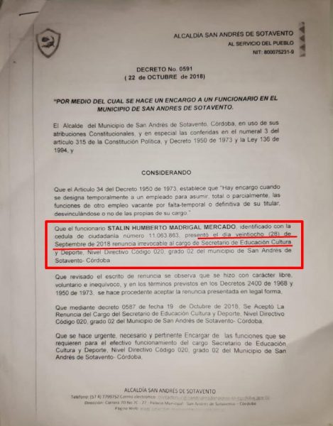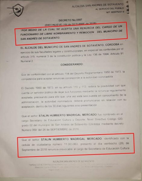 Así, las cosas, encontramos que, según lo expuesto en la que el decreto 0587 del 19 de octubre de 2018, emanada de la Alcaldía de San Andrés de Sotavento, que Madrigal Mercado presentó renuncia irrevocable al cargo el día 28 de septiembre de 2018, renuncia, que fue aceptada a través de este acto administrativo.