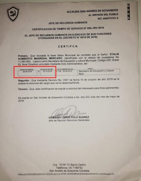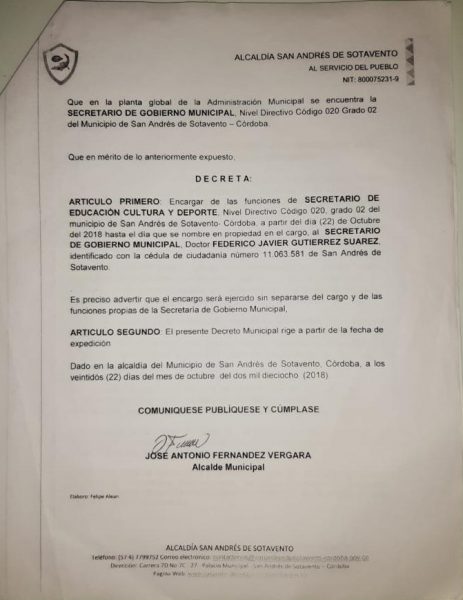 La Lengua Caribe consultó a un experto jurídico cuyo análisis determinó que el alcalde de San Andrés de Sotavento, ejerció el cargo de Secretario de Educación, Cultura y Deporte en la Alcaldía municipal desde el 26 de septiembre de 2016 hasta el 19 de octubre de 2018, fecha en la que se profiere el decreto 0587, por medio del cual se acepta una renuncia del cargo de un funcionario de libre nombramiento y remoción del municipio de San Andrés de Sotavento.