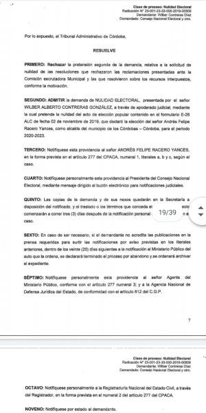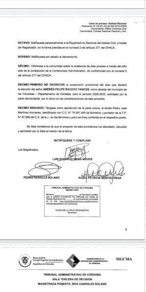 En las últimas horas de este jueves 30 de enero se conoció que fue admitida otra demanda de nulidad electoral contra el alcalde del municipio de Los Córdobas, Andrés Felipe Racero Yances.