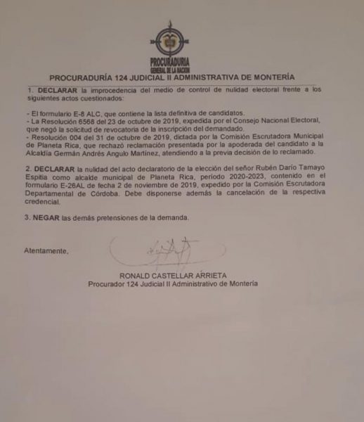 En las últimas horas se conoció que el concepto del Procurador Judicial II Administrativo de Montería es declarar la improcedencia del medio de control de nulidad electoral frente al caso del alcalde de Planeta Rica, Rubén Darío Tamayo Espitia período 2020 – 2023.