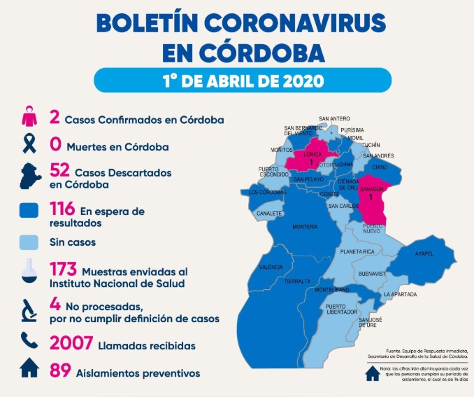 El departamento de Córdoba está a la espera de 116 resultados de pruebas de Coronavirus, las cuales fueron tomadas en Montelíbano, Chimá, Cereté, Los Córdobas, Purísima, Momil, Chinú, San Bernardo del Viento, San Pelayo, Cienága de Oro, Ayapel, Tierralta, Valencia y Montería.
