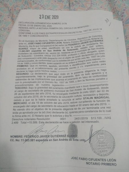 «Bajo la gravedad de juramento manifiesto que estuve desempeñando el cargo de secretario de gobierno municipal de san Andrés de sotavento desde el 26 de septiembre del año 2016, fui encargado mediante decreto 0591 del 22 de octubre del año 2018, de la secretaría de Educación, cultura, recreación y Deportes debido a que se le había aceptado la renuncia al señor Stalin Madrigal», afirmó Gutiérrez, el 19 de octubre de 2018.