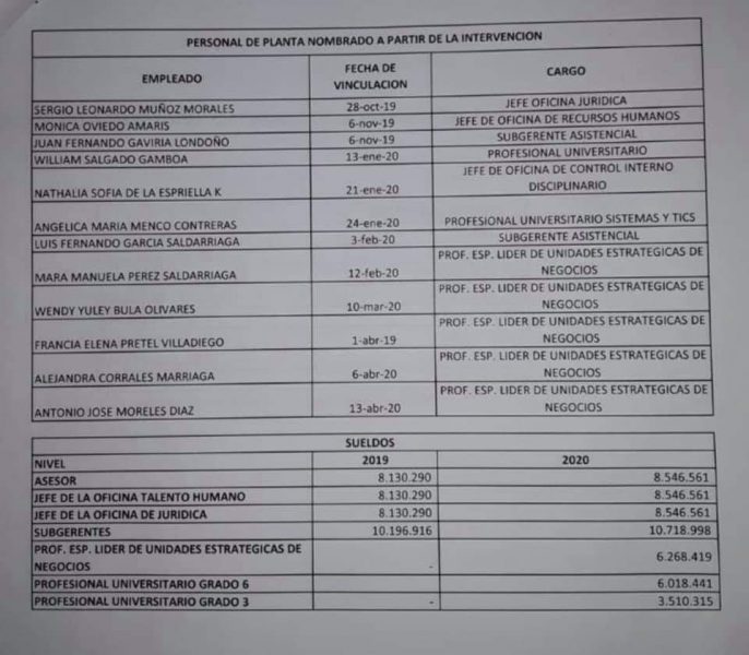 Lo grave de la situación, es que recientemente se conoció que en plena intervención más de 10 personas fueron nombradas de planta por sueldos que superan $6.000.000, lo que ha dejado dudas sobre su actual manejo a cargo del agente interventor, Rubén Dario Trejos.