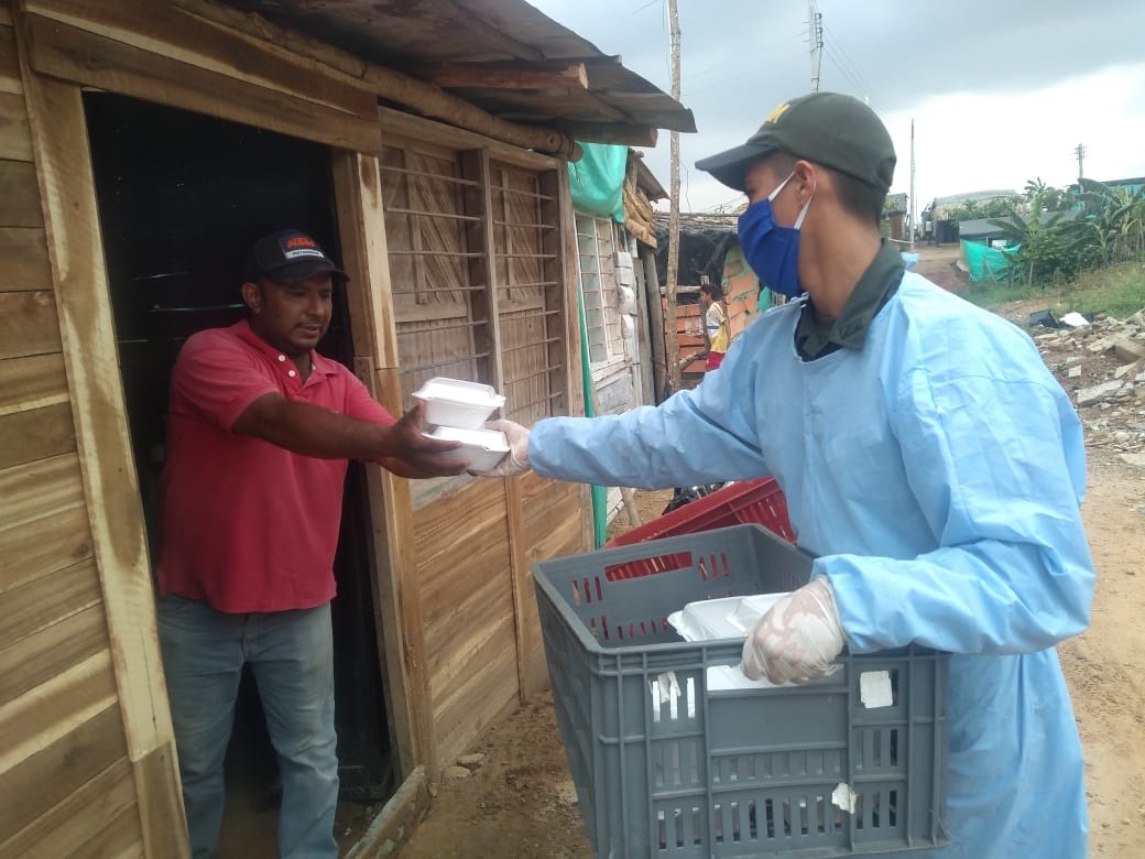 Los alimentos se preparan bajo todas las medidas sanitarias y con los elementos de bioseguridad. Los policías y soldados recorren puerta a puerta las viviendas para hacer la entrega a la población que se encuentra más necesitada durante la crisis por el Covid-19.
