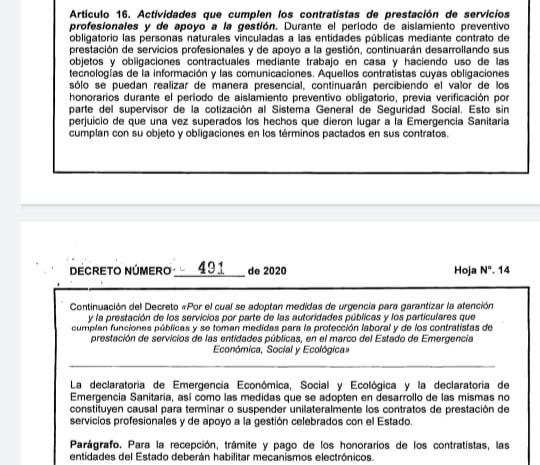 Sin embargo, para el personal afectado es inadmisible que se queden sin empleo, teniendo en cuenta que el decreto 491 del 2020, Articulo 16, sobre las “actividades que cumplen los contratistas de prestación de servicios profesionales y de apoyo a la gestión”, estos no podrán ser despedidos durante la cuarentena.
