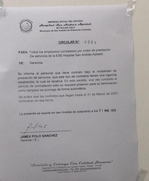 A través de un comunicado que está pegado en una de las paredes de la ESE, el gerente Jamex Polo Sánchez, notificó a médicos y enfermeras que están por esta modalidad de trabajo, que a partir de este martes 31 de marzo no será prorrogado su contrato, dicha medida no admite discusión según la misiva.