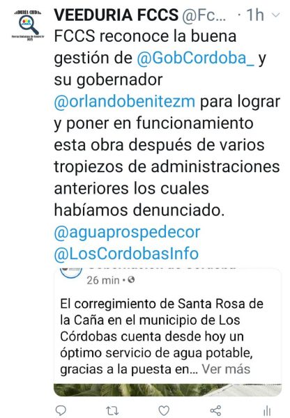 Percatado el gobernador de Córdoba de los contratiempos de la obra, se puso en la tarea y búsqueda de soluciones a los atrasos presentados, logrando darle solución, entregando la obra en funcionamiento en óptimas condiciones a los habitantes del corregimiento de Santa Rosa de la Caña, quienes hoy agradecen al burgomaestre por todas las gestiones realizadas en tiempo récord.