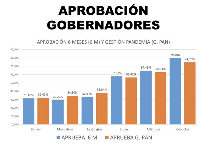 Con un 79.90% de aprobación durante los primeros seis meses de gestión, el mandatario cordobes se encuentra por encima de de los gobernadores de Atlántico (64.49%), Sucre (57,87%), Guajira (32.97%), Magdalena con (29,27%) y Bolívar con (31,40%)