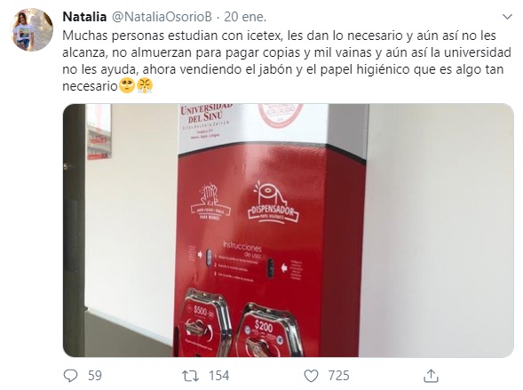 La internauta identificada en esa red social como ‘NataliaOsorioB’, cuestionó el cobro de estos productos de aseo personal y manifestó que «Muchas personas estudian con icetex, les dan lo necesario y aún así no les alcanza, no almuerzan para pagar copias y mil vainas y aún así la universidad no les ayuda, ahora vendiendo el jabón y el papel higiénico que es algo tan necesario».