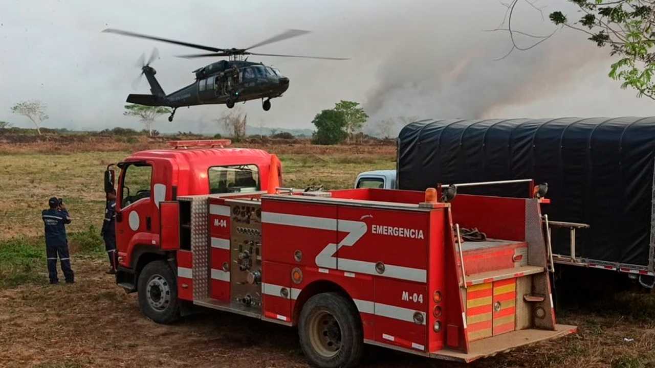 De igual forma, un helicóptero de la Fuerza Aérea Colombiana, integrado con el sistema ‘Bambi Bucket’, adelantó labores de aspersión de agua sobre las llamas. Con esta operación aérea se realizaron más de 34 descargas, equivalentes a 21.760 galones de agua y de líquido retardante.