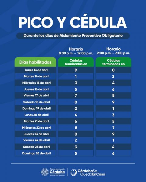 A través de Twitter el gobernador de Córdoba, Orlando Benítez, dio a conocer el nuevo pico y cédula que comenzará a regir en el departamento durante las próximas dos semanas.