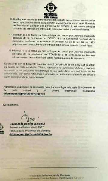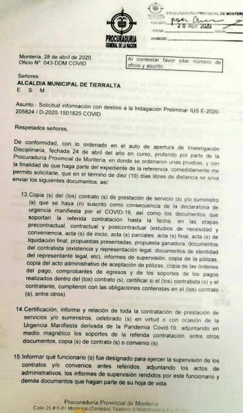 Según el documento emitido por el Ministerio Público, el mandatario tierraltense deberá enviar en el término de 10 días libres de distancia, copias del contrato de prestación de servicio o suministro que se haya suscrito como consecuencia de la declaratoria manifiesta por la propagación de la pandemia.