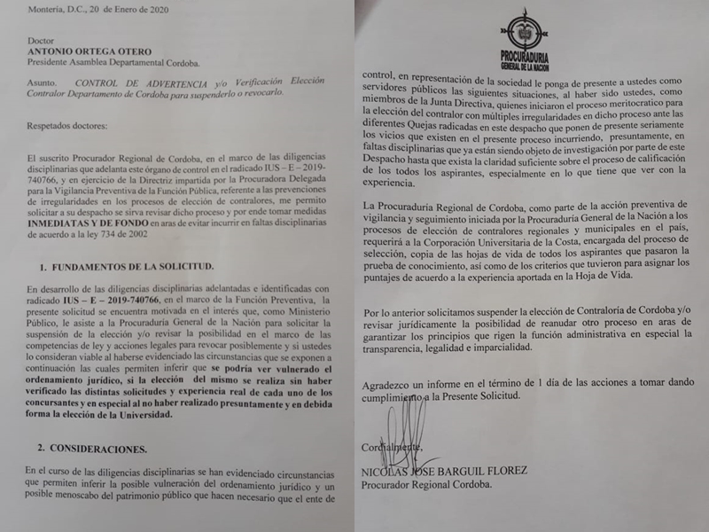 En el documento firmado por el procurador regional, Nicolás Barguil Flórez, y enviado al presidente de la Asamblea de Córdoba, diputado Antonio Ortega Otero, le solicita la suspensión del proceso y de no hacerlo incurriría en faltas disciplinarias junto a la directiva de la Duma.