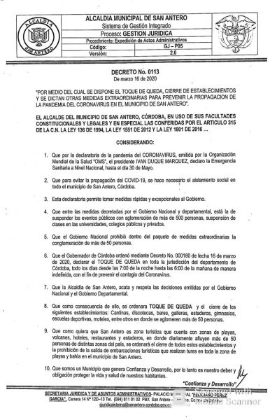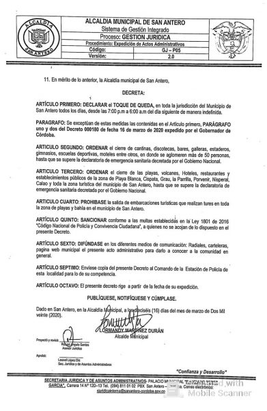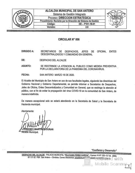 Acatando las órdenes del gobierno nacional y departamental, el alcalde de San Antero, Lormandy Martínez, emitió una circular con estrictas medidas como prevención por el coronavirus.