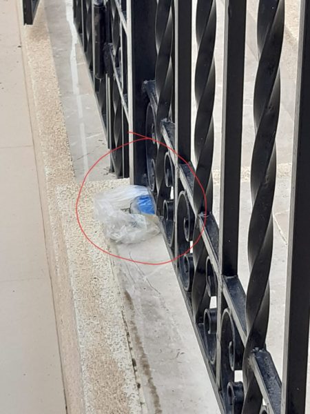 En las fotografías se puede observar como algodones y frascos de muestras de orina están en la calle y algunos en las terrazas aledañas a la entidad.