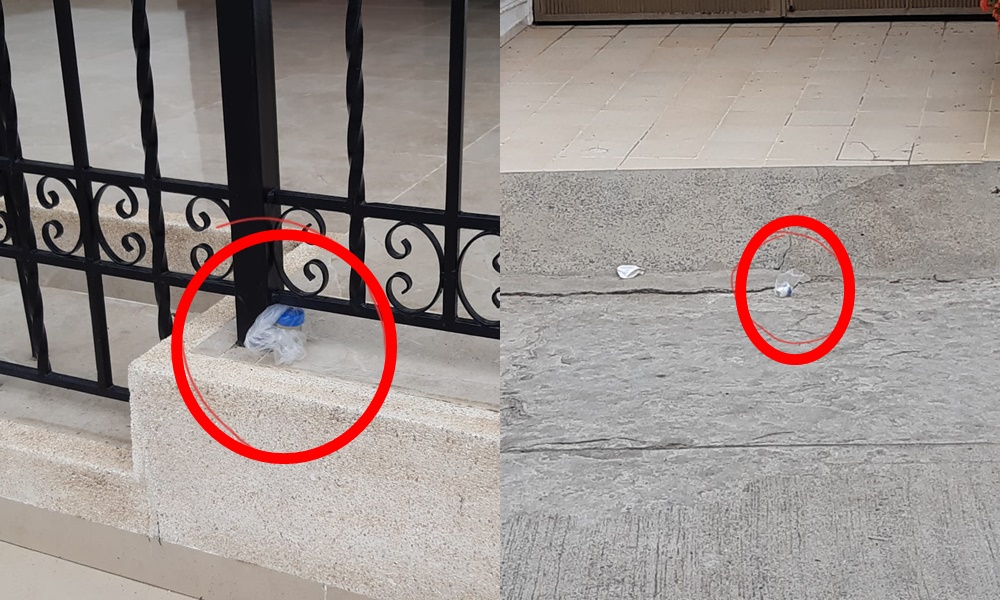 En las fotografías se puede observar como algodones y frascos de muestras de orina están en la calle y algunos en las terrazas aledañas a la entidad.