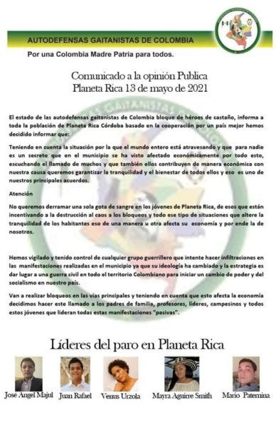 El escrito firmado por las Autodefensas Gaitanistas de Colombia, popularmente conocidas como ‘Clan del Golfo’, estaría circulando en varias cadenas de WhatsApp, donde figurarían los nombres y las fotografías de estas personas que serían líderes de las marchas en la localidad.