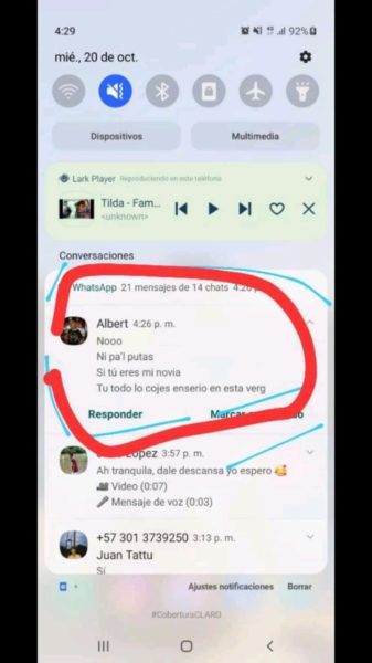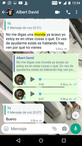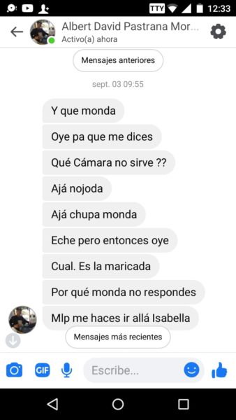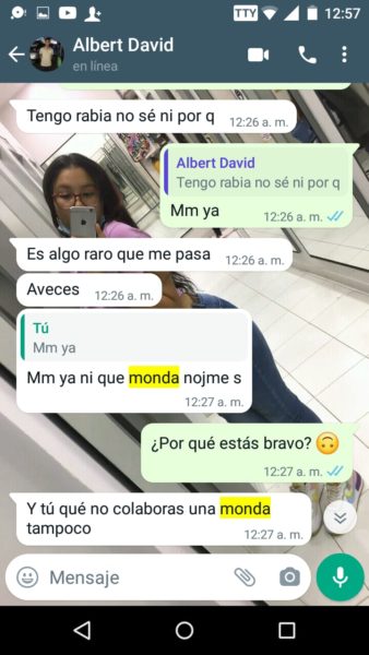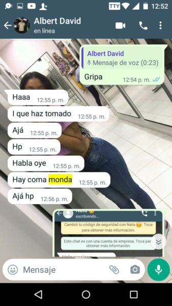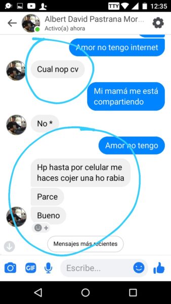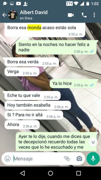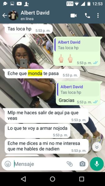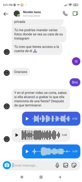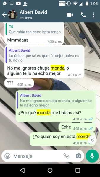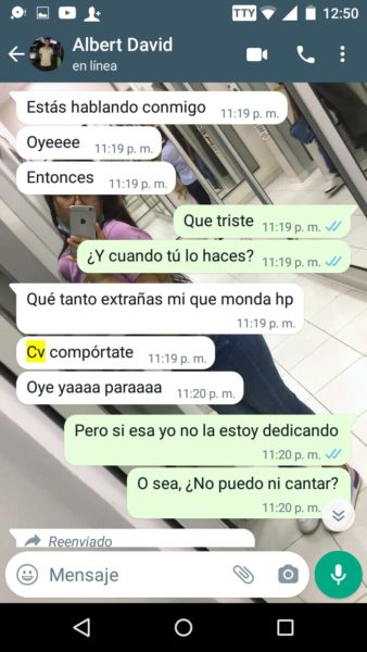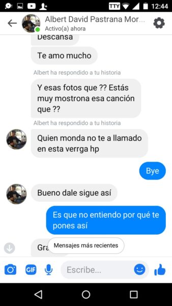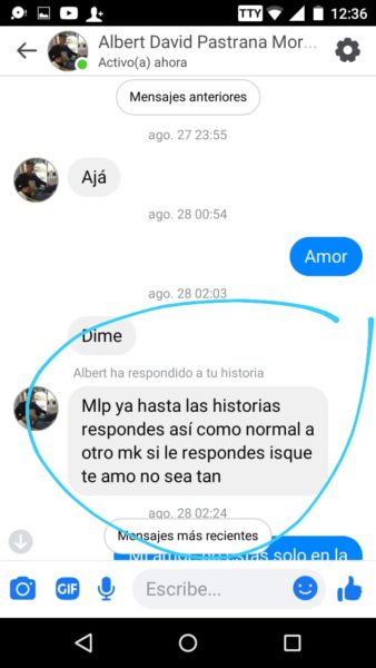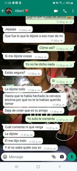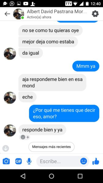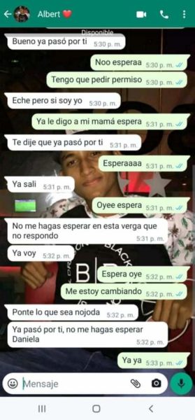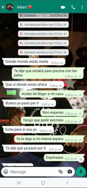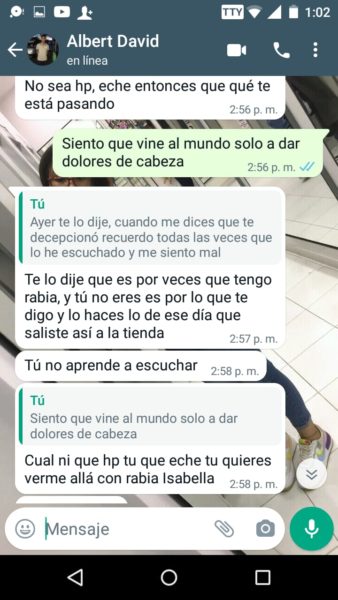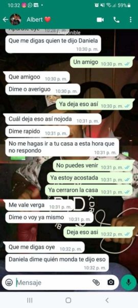 “Sus papás siempre supieron porque escuchaban los gritos y me veían los moretones y hasta cuando me pegaban las noches, ellos también sabían y no hacían absolutamente nada”, agregó Isabela, quien además de publicar en redes sociales, también nos envió los captures en forma de pruebas, del fuerte trato que recibía por parte del joven acordeonero, quien recientemente se coronó rey vallenato juvenil del acordeón en Caucasia, Antioquia.
