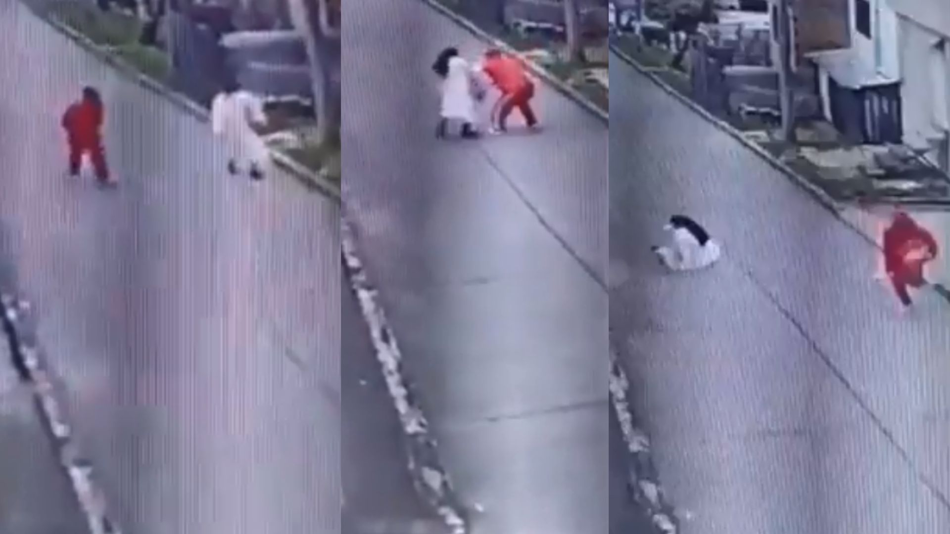 Una cámara de seguridad instalada en un poste de electricidad captó el hecho en el que el sujeto se acerca a la monja y la empuja sobre el suelo de la vía para hurtarle sus pertenencias.
