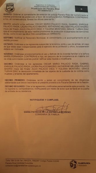 La mujer indicó que busco ayuda en la Defensoría del Pueblo y en la Comisaría de Familia, quien estudió el caso detalladamente e hizo la respectiva visita, llamó a audiencias y confirmó que estas personas estaban ejerciendo cierta violencia, motivo por el cual la Comisaría de Familia les ordenó el desalojo de la vivienda, medidas de distanciamiento y que fuesen devueltos los enseres, muebles y electrodomésticos que se habían llevado.