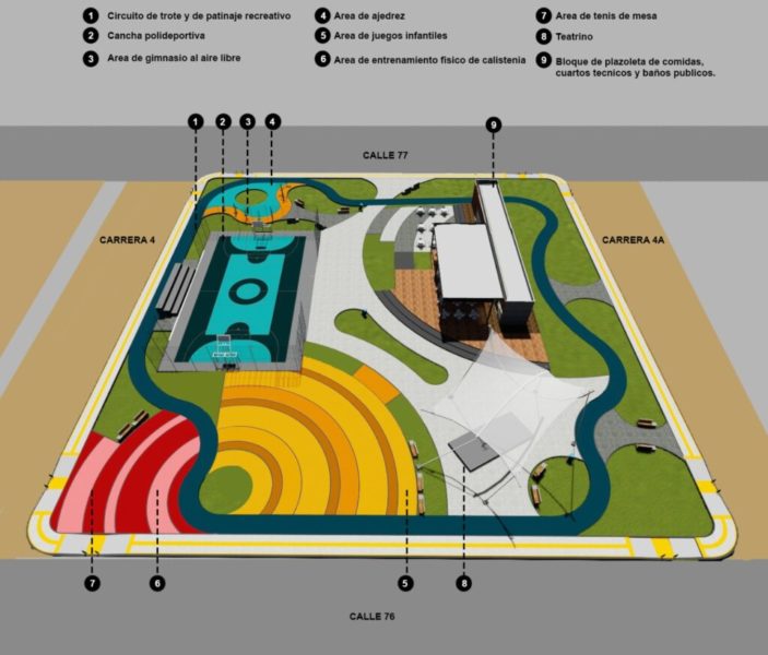 El espacio de recreación que beneficiará a un sinnúmero de familias de ese sector de la capital cordobesa, estará ubicado entre calles 76 y 77 con carrera 4 y carrera 4A, barrio San Francisco y tendrá un área de 5180 m2.
