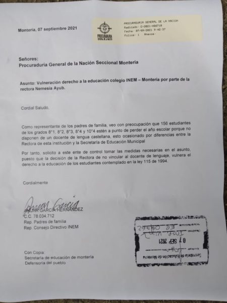 “Solicito a este ente de control tomar las medidas necesarias en el asunto, puesto que la decisión de la rectora de no incluir al docente de lenguaje vulnera el derecho a la educación de los estudiantes contemplado en la ley 115 de 1994”, se lee en la misiva.