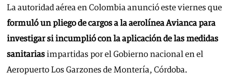 La medida fue tomada contra la aerolínea Avianca, con el fin de establecer si incumplió o no con la aplicación de las medidas sanitarias impartidas por el Gobierno Nacional en el aeropuerto de os Garzones de Montería.