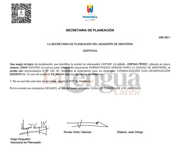 Tras la denuncia de La Lengua Caribe sobre el supuesto funcionamiento de una funeraria en plena zona residencial de Montería, la Secretaría de Planeación, en cabeza de Hugo Kerguelen negó el uso de suelo solicitado.