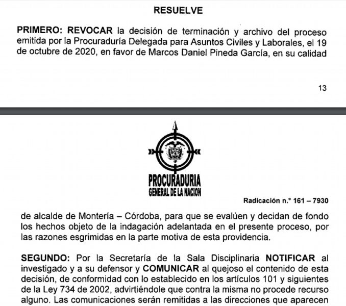 En las últimas horas se conoció que, la Procuraduría General de la Nación revocó el fallo en el que se había archivado el proceso contra el exalcalde de Montería, Marcos Daniel Pineda García.