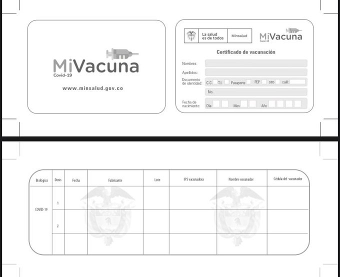 Para llevar un control y registro del Plan de Vacunación Nacional contra el Covid-19, el Ministerio de Salud manifestó que, las IPS vacunadoras tendrán en su poder los carnés hechos por la imprenta nacional, el cual será entregado a cada ciudadano que se aplique el biológico.