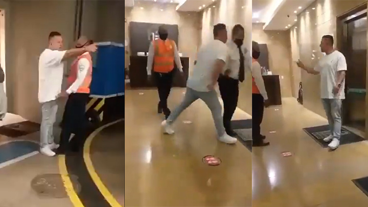 En el registro captado al parecer por uno de los celadores del prestigioso edificio se observa como el turista increpa y hasta empuja a uno de los vigilantes, mientras éste solo guarda silencio.