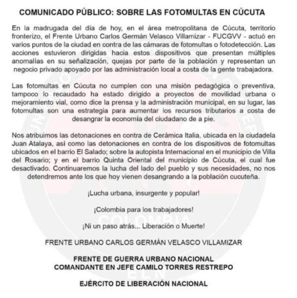La guerrilla del ELN se adjudicó las explosiones registradas en las cámaras de fotomultas el barrio El Salado de Cúcuta, el anuncio lo hicieron a través de un comunicado.