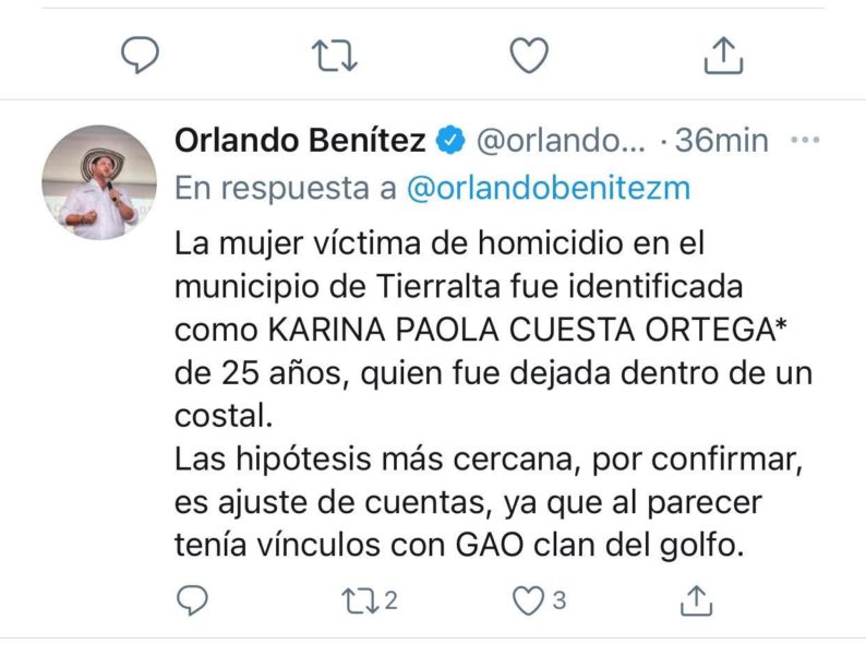 El trino en mención se dio tras el asesinato de la joven Karina Paola Cuesta Ortega en el municipio de Tierralta, horas después del homicidio el gobernador Benítez manifestó que la mujer de 25 años fue dejada dentro un costal e indicó lo siguiente «la hipótesis más cercana, por confirmar, es ajuste de cuentas, ya que al parecer tenía vínculos con GAO Clan del Golfo».