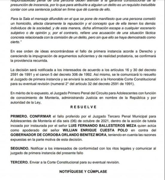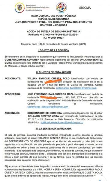 El caso se fue hasta los juzgados y el día 11 de noviembre de 2021 un juez de segunda instancia determinó que el gobernador de Córdoba había hecho afirmaciones que “endilgan conductas delictivas a la joven Cuesta Ortega, sin pruebas, dañando el buen hombre y la honra de la víctima y su familia, por lo que le fue ordenado en un término de 48 horas siguientes a la notificación, proceder a pedir disculpas a través de una publicación en Twitter y bajo las mismas condiciones de la emisión cuestionada”, alegando que Benítez Mora no contaba con las pruebas necesarias para sostener dicha afirmación.