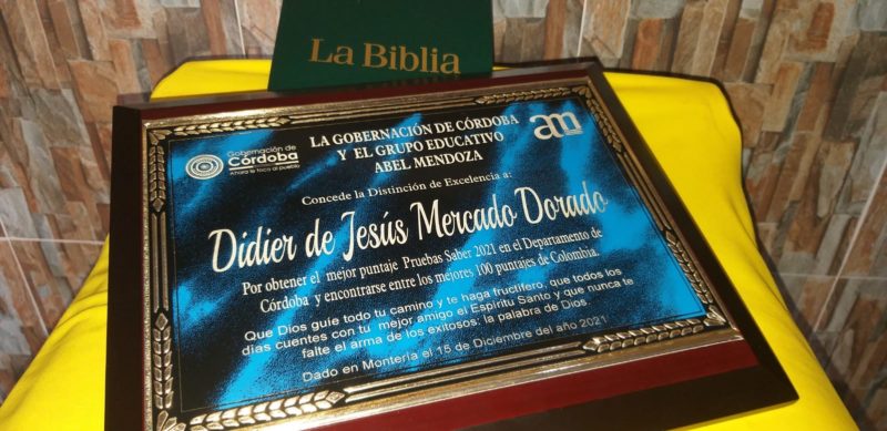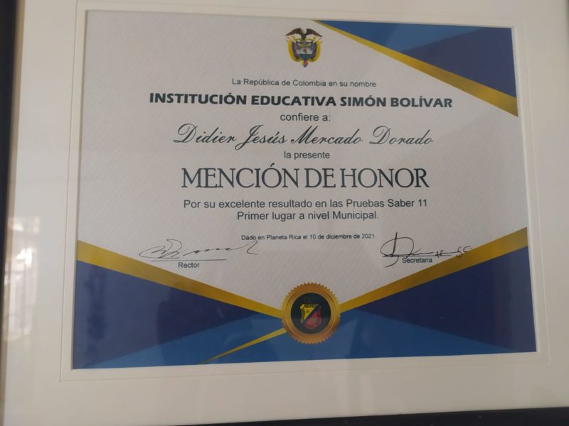 Didier Jesús Mercado Dorado es un joven de 17 años de edad que se destacó en las pruebas Saber 11 calendario A del 2021, obtuvo un puntaje de 407, logrando estar entre los mejores de Colombia.