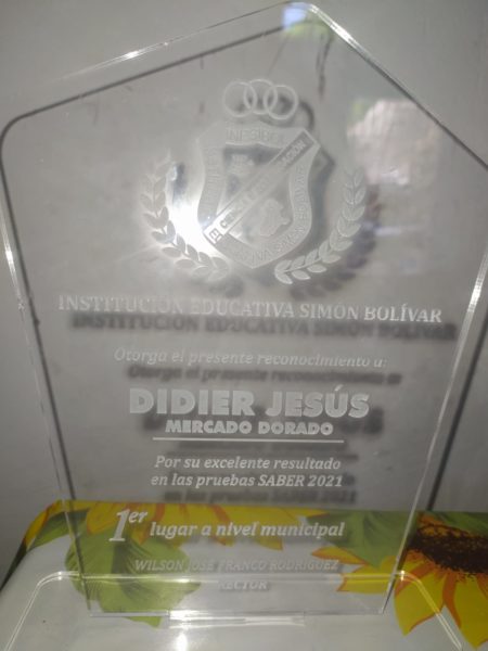 Desde la Gobernación de Córdoba y el Grupo Educativo Abel Mendoza, Didier recibió una placa en el marco de una ceremonia de conmemoración en donde se exaltó el desempeño de 72 jóvenes cordobeses que se destacaron en las pruebas, el joven estuvo dentro de los cuatro estudiantes de los 27 municipios no certificados y Montería que fueron reconocidos entre los 100 mejores a nivel Nacional.